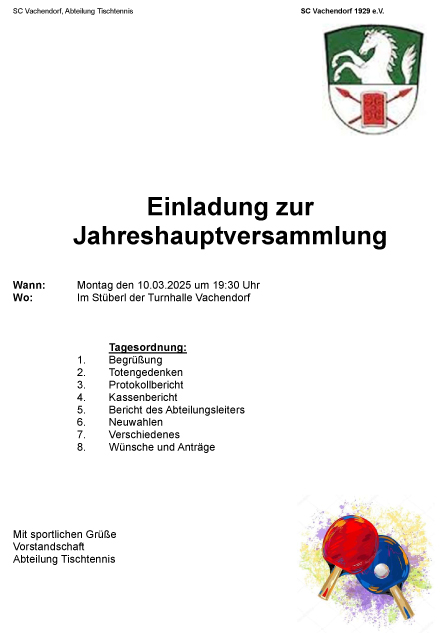 Die Mitgliederversammlung 2025 „Abt. Tischtennis“ findet findet am Montag, den. 10. März um 19:30 Uhr, „Im Stüberl der Turnhalle“ in Vachendorf statt..